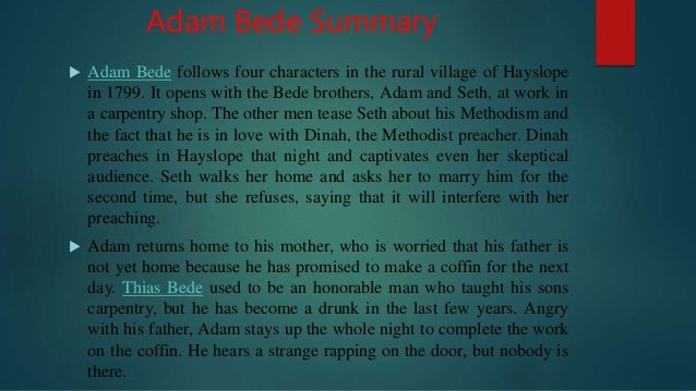 Adam Bede Summary and Analysis of Book Second. The other men tease Seth about his Methodism and the fact that he is in love with Dinah the Methodist preacher. Adam Bede - Plot Summary.